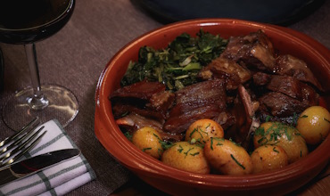Vitela assada, com batatinha assada, arroz branco e esparregado de grelos