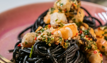 Calamares com esparguete nero salteado ao alho, pimento e salsa